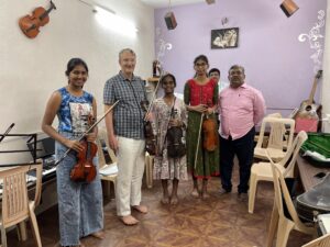 Daniel Schad hat sich über viele Jahre einen Kontakt zu den Streicher-Kolleg:innen in Bangalore, Chennai und Coimbatore in Süd-Indien aufgebaut. Die vorgefundenen Instrumente waren oft in einem schlechten Zustand. Die Begeisterung der Menschen für die Musik von Bach, Händel oder Vivaldi war aber umso größer und herzlicher.